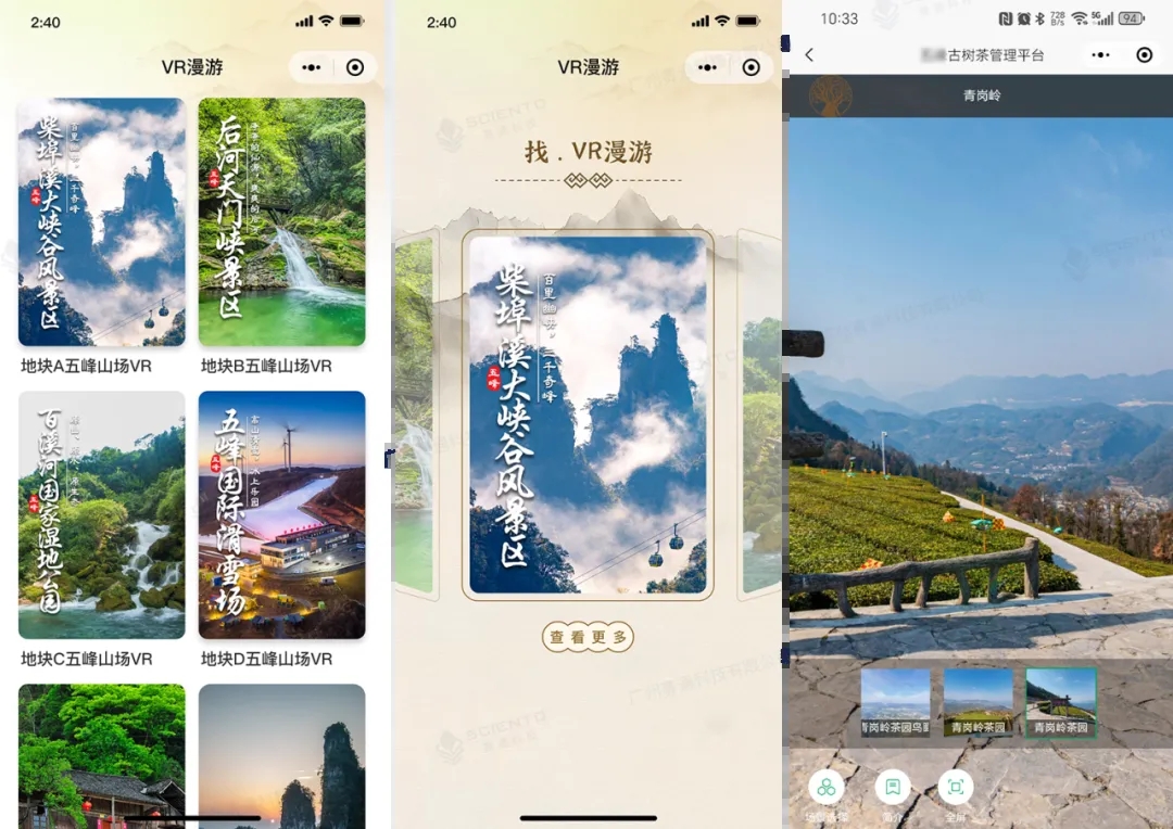 賽通科技巧妙運用全景VR技術,以虛擬空間技術為載體,讓用戶跨空間跨時間與百年古茶樹對話,沉浸式走進疊翠茶山,只需指尖輕點,就可輕松切換茶山環境,實現360°全方位場景環顧。